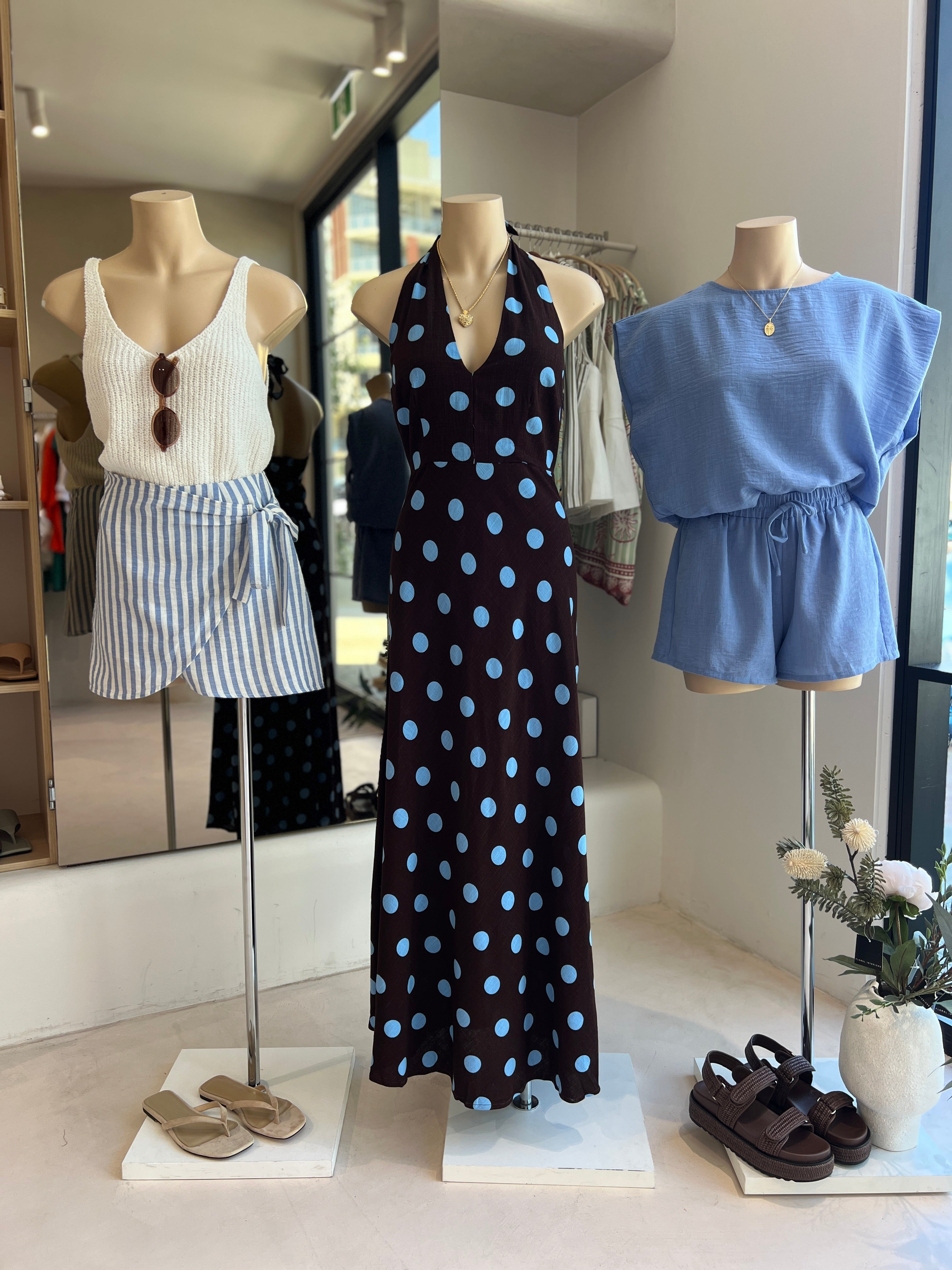 The Tanzi Skirt is a relaxed wrap mini, designed to sit comfortably on the waist with an adjustable side tie. The blue stripe colour way gives it a fun look that’s easy to pair with your everyday tees or linen shirts.