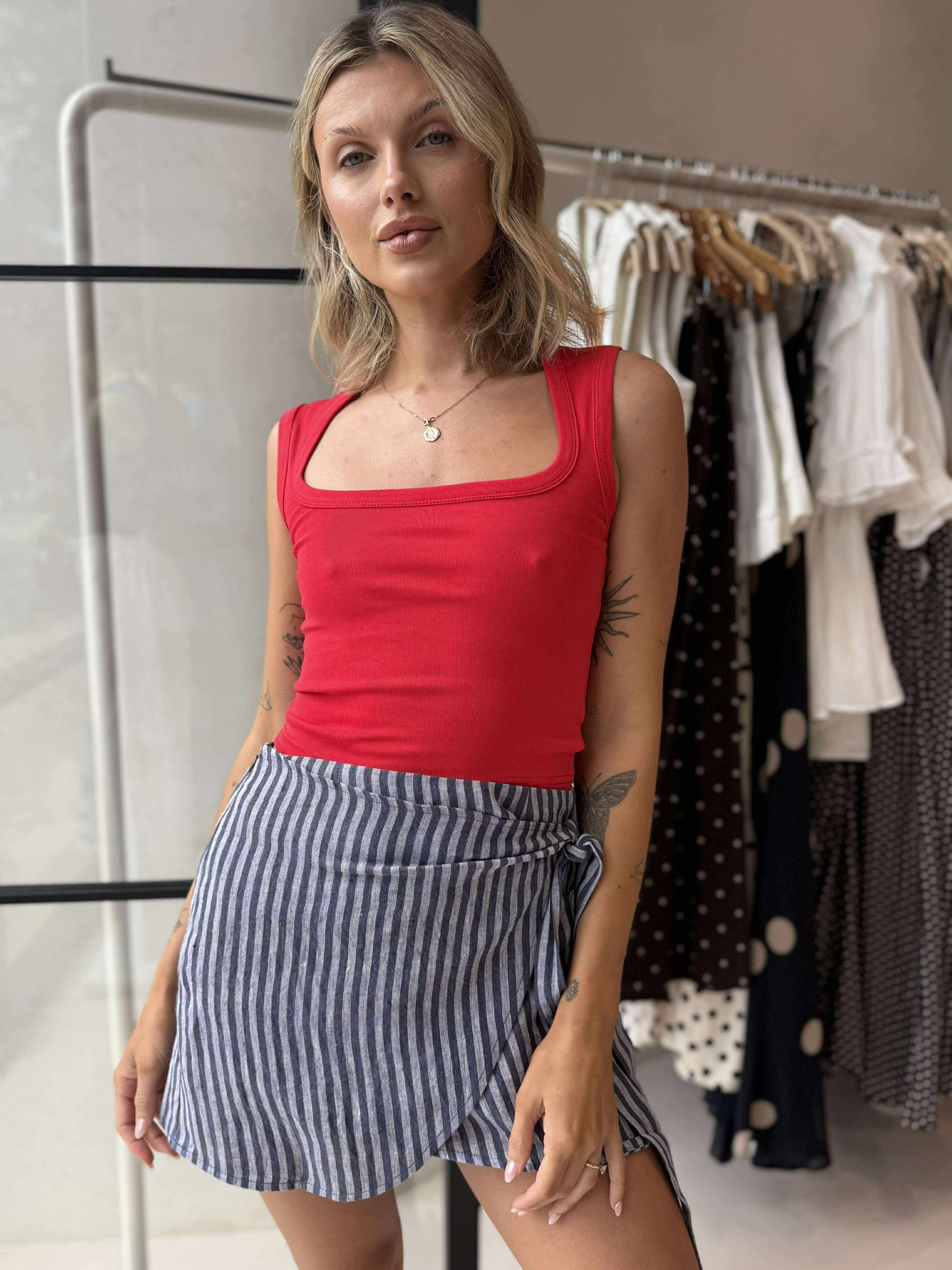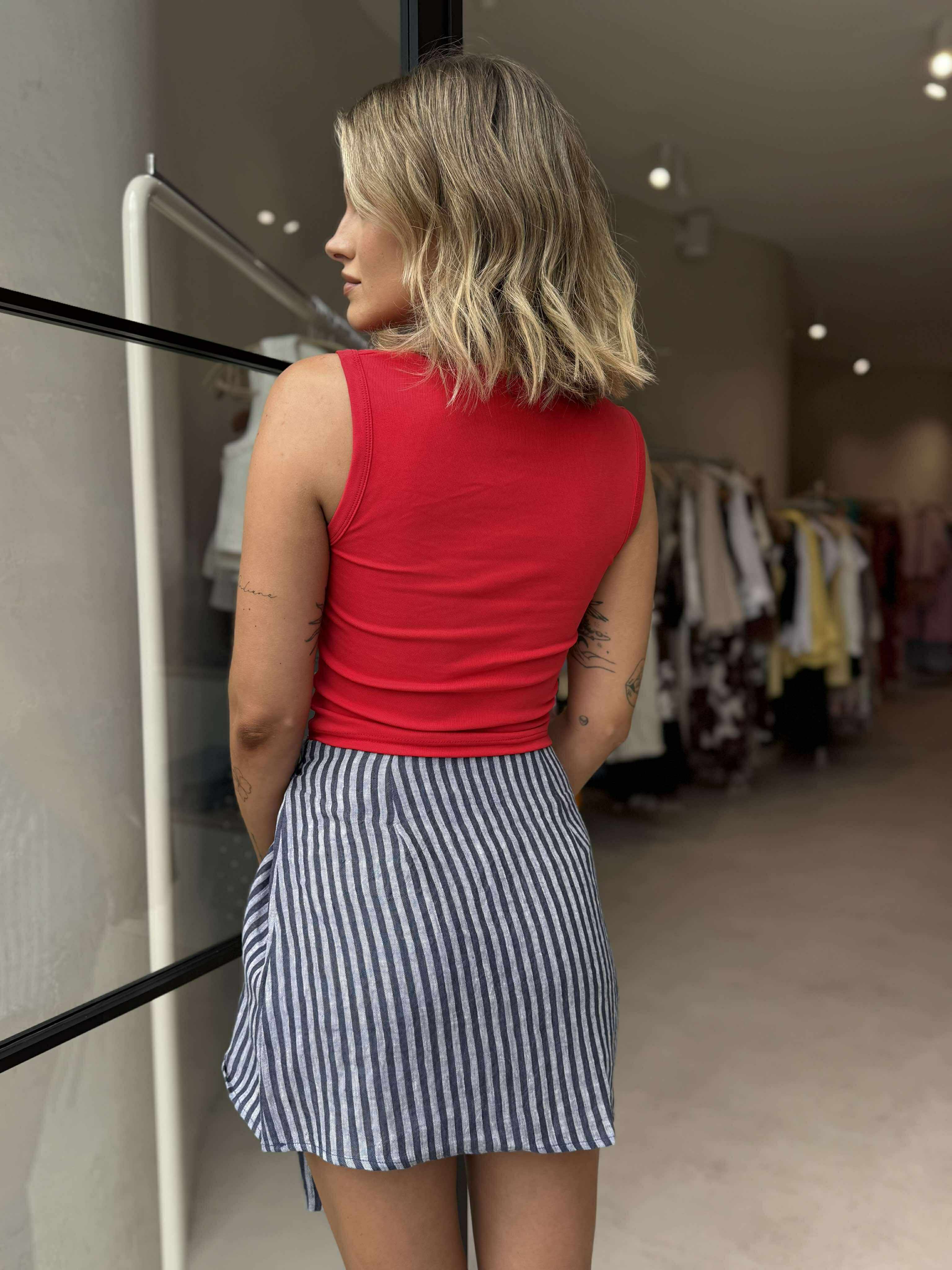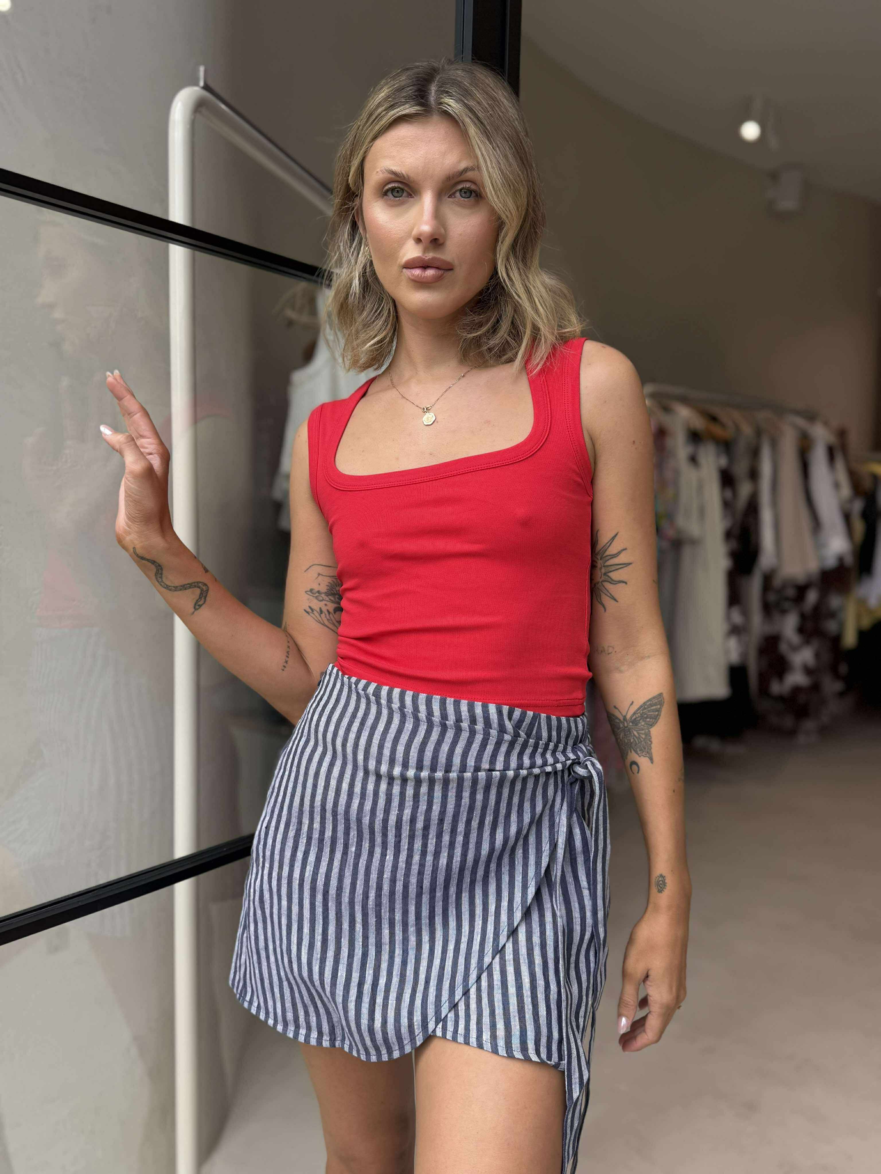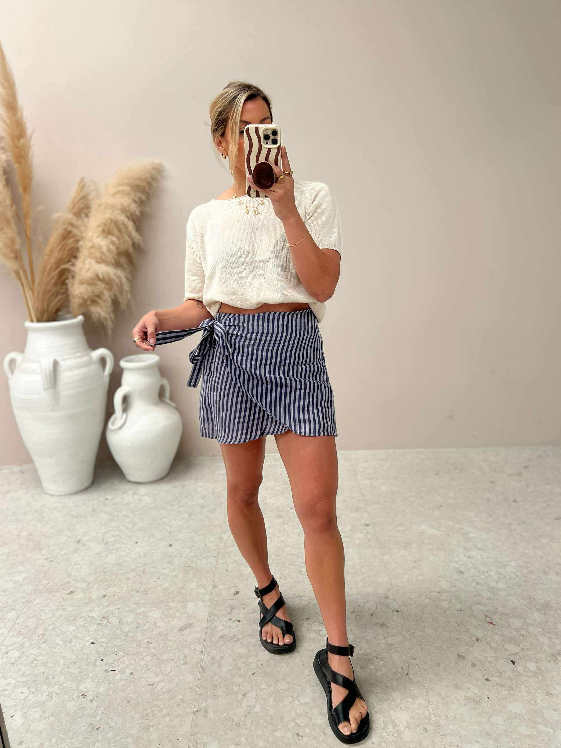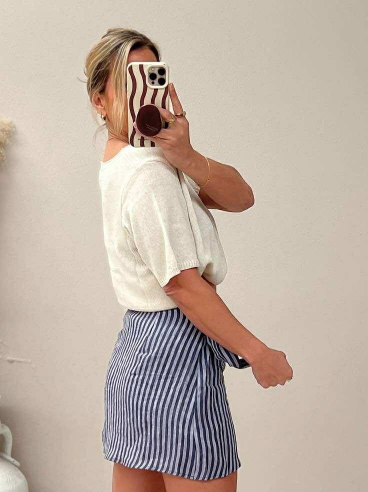 The Tanzi Skirt is a relaxed wrap mini made from 100% linen, designed to sit comfortably on the waist with an adjustable side tie. The navy stripe colour way gives it a fun look that’s easy to pair with your everyday tees or linen shirts.