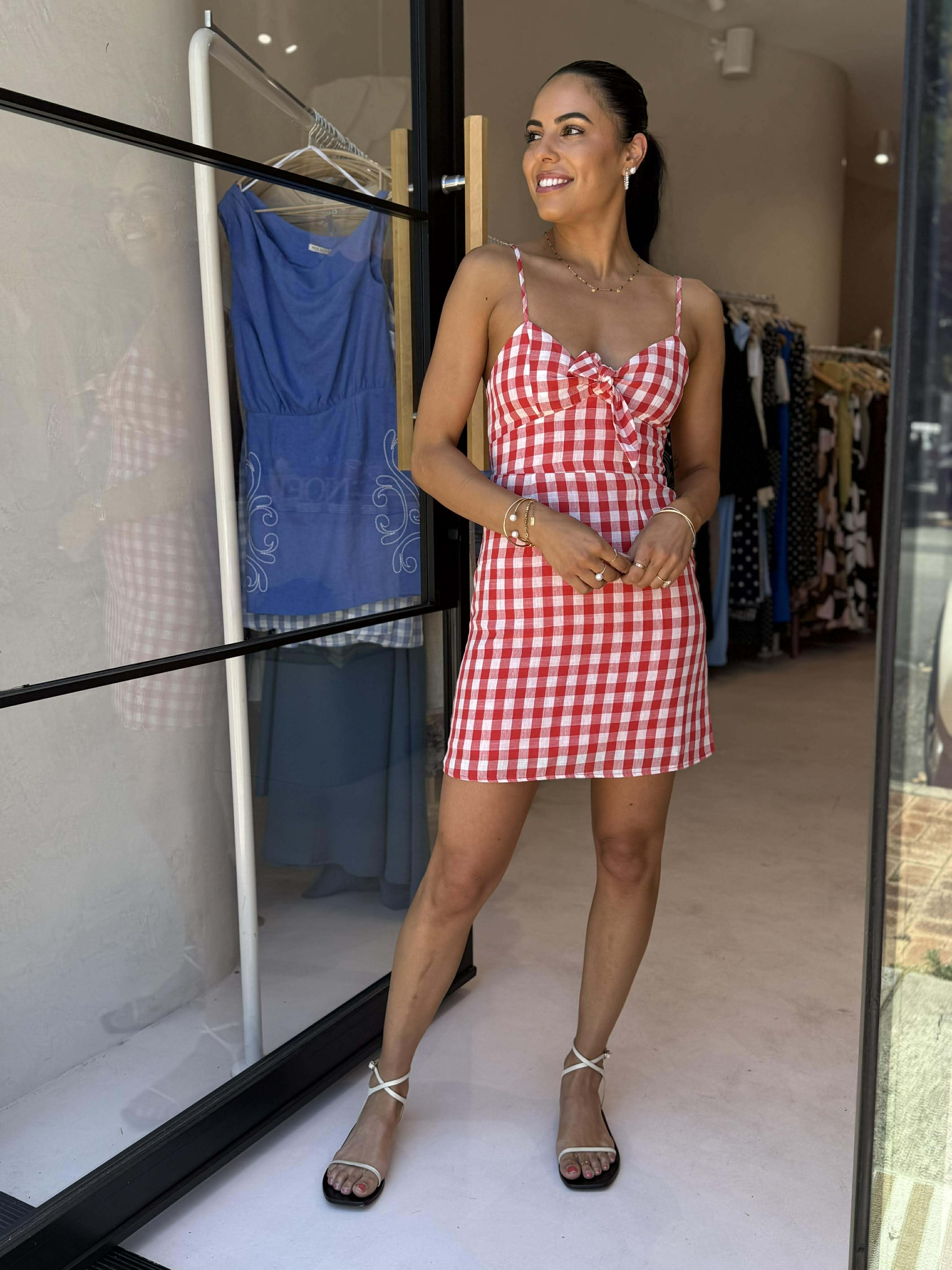 - Red and white checkered mini dress