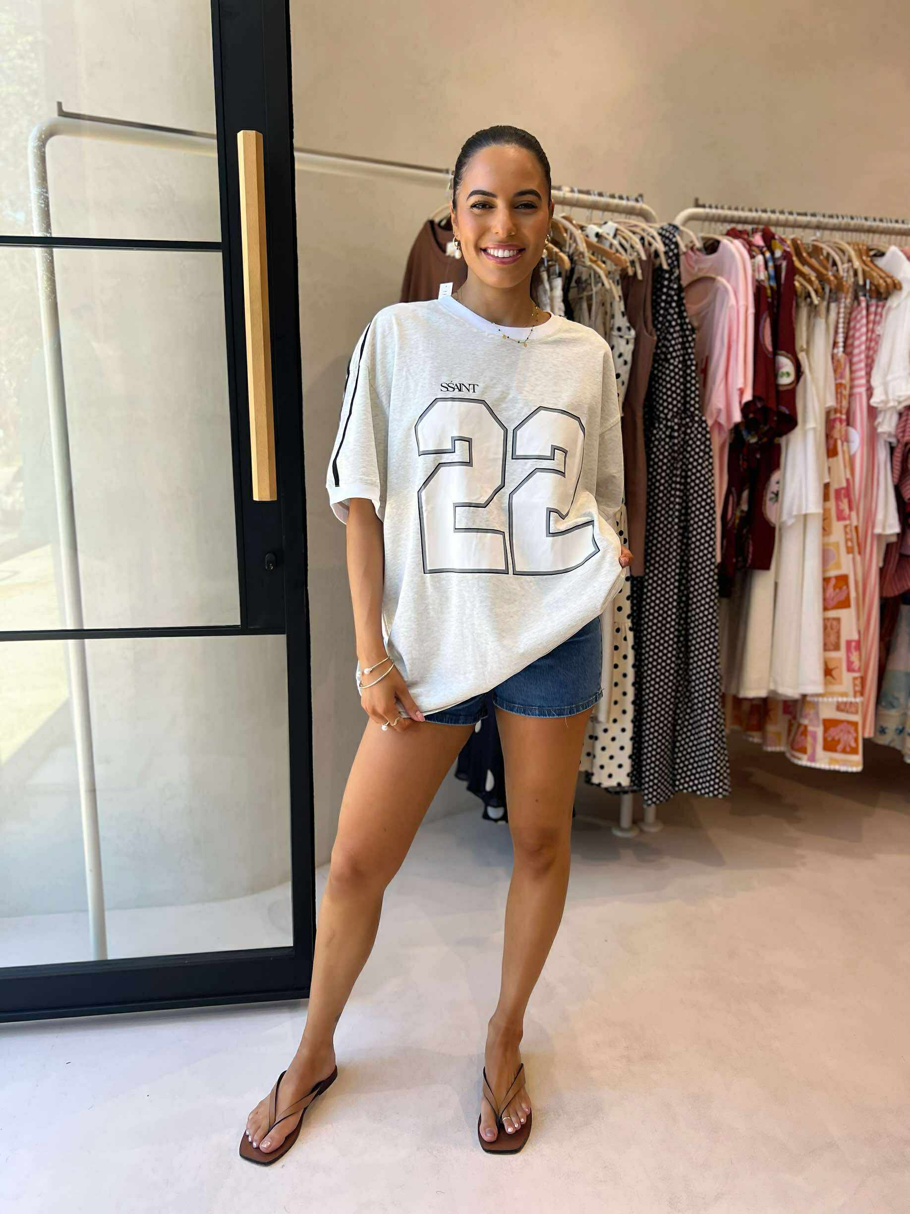 This bold white tee features 22 numbers on the front, complemented by black stripes on the shoulders and sleeves for a football jersey-inspired look.