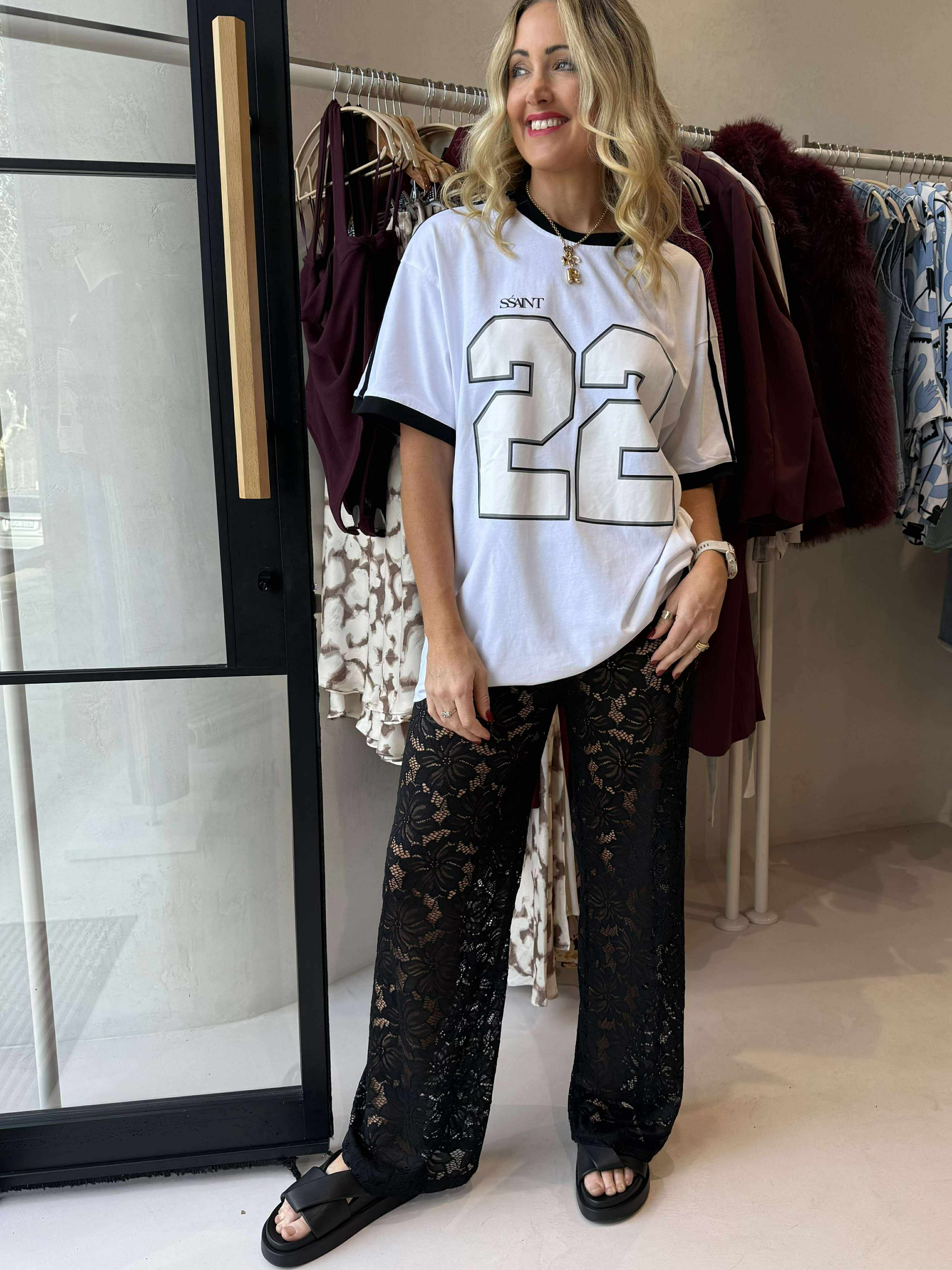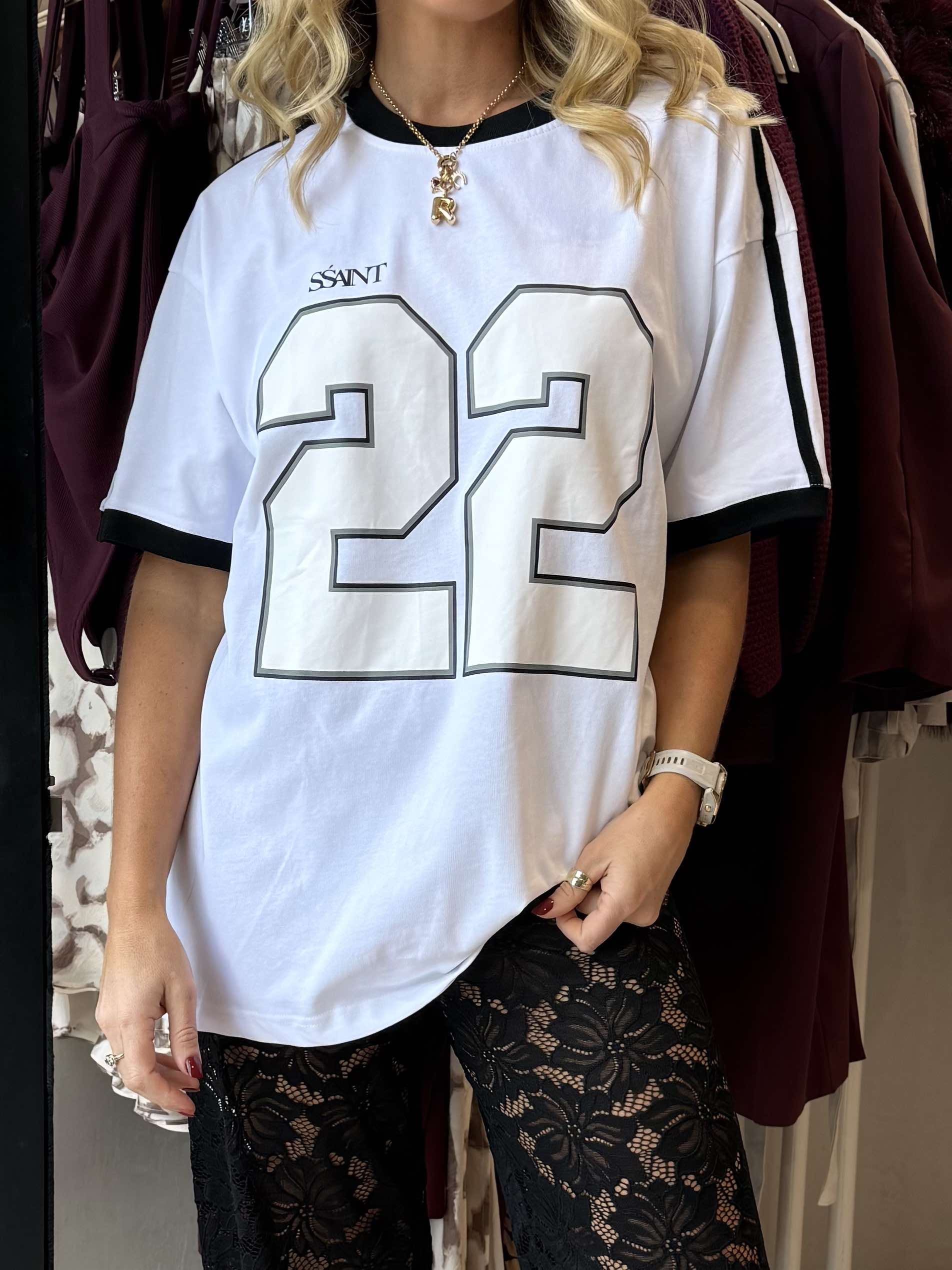This bold white tee features 22 numbers on the front, complemented by black stripes on the shoulders and sleeves for a football jersey-inspired look.