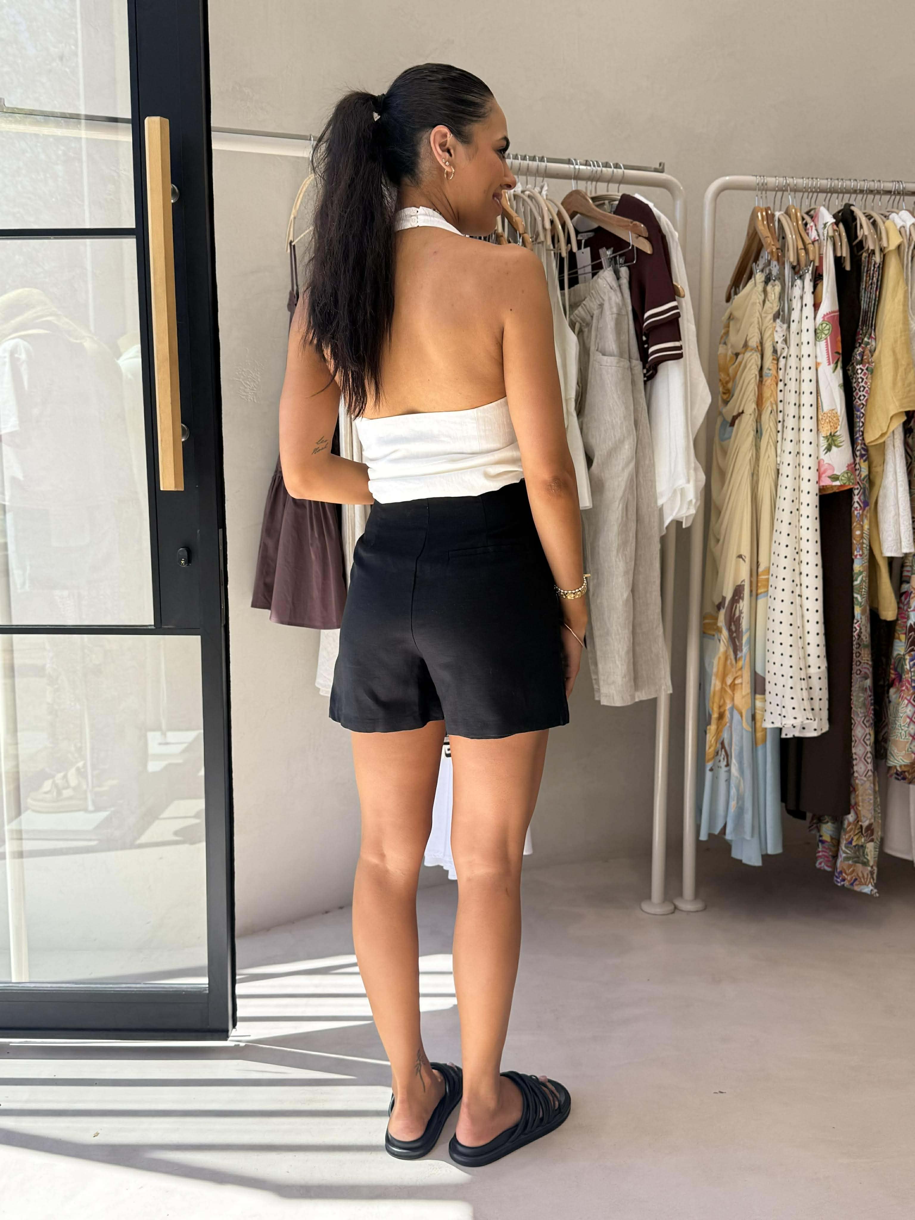 The Zayda Linen Vest is made from 100% Linen which has been washed for a soft, breathable hand feel. The halter neck silhouette is tailored to fit close to the body and finishes below the hips. Features include a halter neck v neckline, open back and button opening at front. This vest is fully lined.
